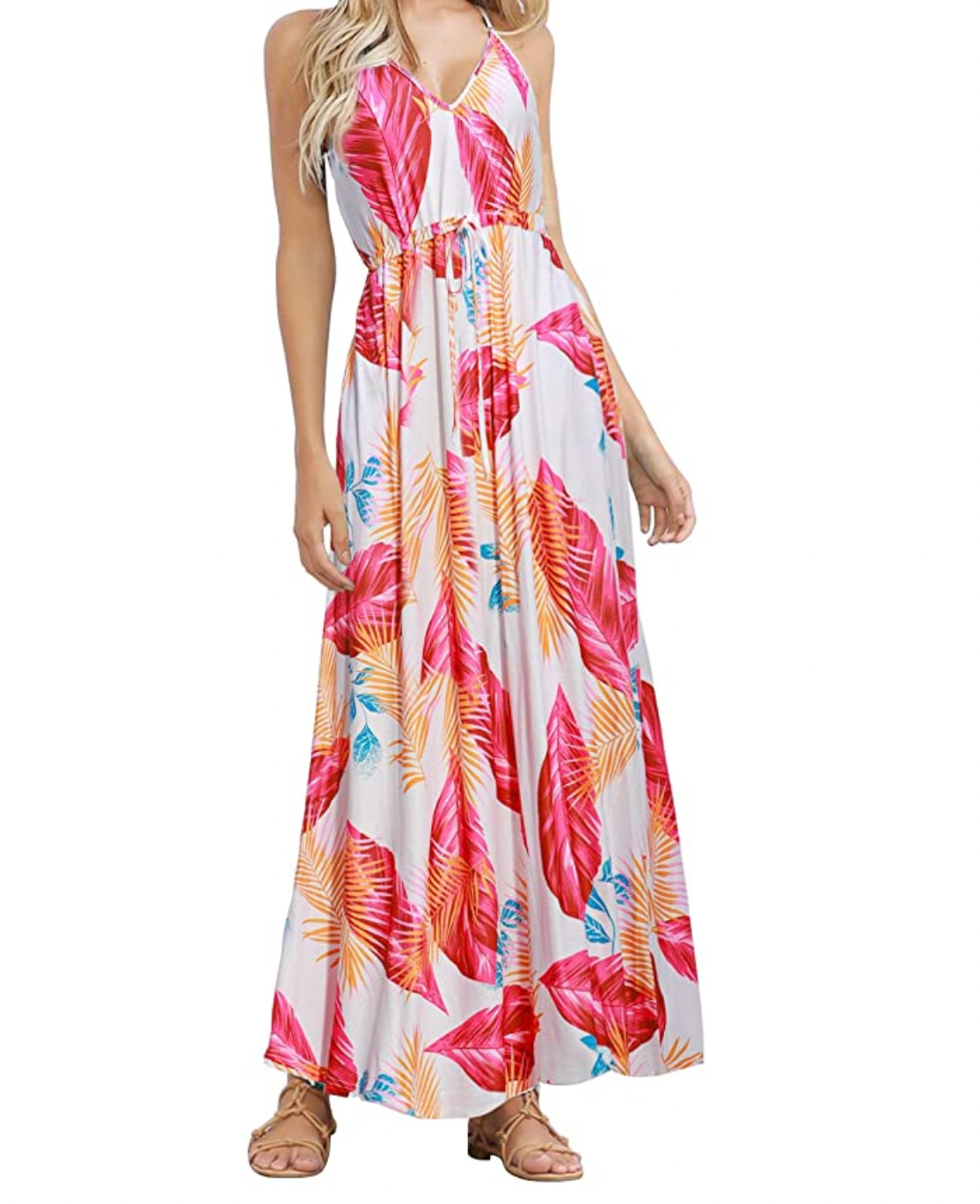 Add a splash of color to your summer wardrobe with this tropical print maxi dress with flattering drawstring to show off your figure.